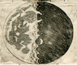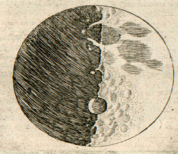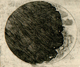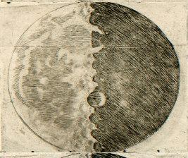 En réalité, non seulement les frontières entre les ténèbres et la lumière sont, sur la Lune, visiblement inégales et sinueuses, mais — ce qui suscite un plus grand émerveillement — un très grand nombre de points brillants apparaîssent au sein de la partie ténébreuse de la Lune, entièrement séparés et détachés de l’étendue illuminée et éloignés d’elle par un intervalle qui n’est pas peu considérable. Ces points augmentent peu à peu, après quelque temps, en grandeur et en luminosité ; après deux ou trois heures, ils se joignent au reste de la partie brillante, qui s’est agrandie désormais. Entre-temps, toutefois, de plus en plus de points, qui pullulent, pour ainsi dire, de-ci, de-là, dans la partie ténébreuse s’allument, augmentent, et finalement s’unissent à la surface lumineuse, qui est encore plus étendue maintenant. La figure de la page précédente nous en montre un exemple. Or, n’est-il pas vrai que sur la Terre, avant le lever du Soleil, quand l’ombre occupe encore la plaine, les sommets des monts les plus élevés sont illuminés par les rayons solaires ? qu’après un court laps de temps, la lumière se répand, tandis que les parties médianes, plus larges, de ces mêmes monts s’illuminent ? Enfin, lorsque le Soleil est déjà levé, les illuminations des plaines et des collines ne se rejoignent-elles pas ? Mais sur la Lune, ce type de différence entre les élévations et les cavités semble dépasser de très loin l’inégalité du relief terrestre, comme nous le montrerons plus loin [4].